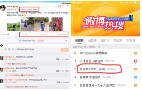 用华为P30系列手机而被广大网友热议的明星不止甄子丹一个,首位华人世界小姐张梓琳前几天就登上了热搜。7月14日,张梓琳用华为P30 Pro拍照片发微博,因为女儿身高被网友推上了热搜第二名,也许张梓琳自己都没有想到吧。